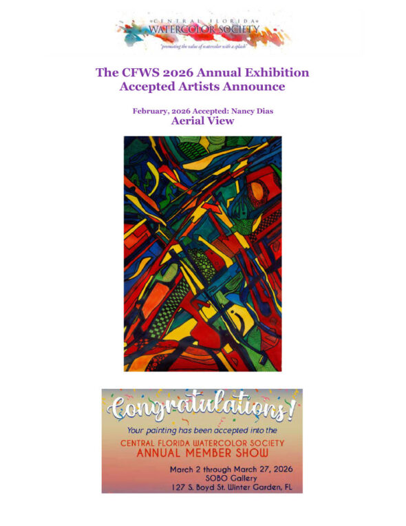 Nancy Dias’ painting, Exploration, will be shown at the 45th Annual Florida Watercolor Society’s exhibition this fall in Ocala FL.