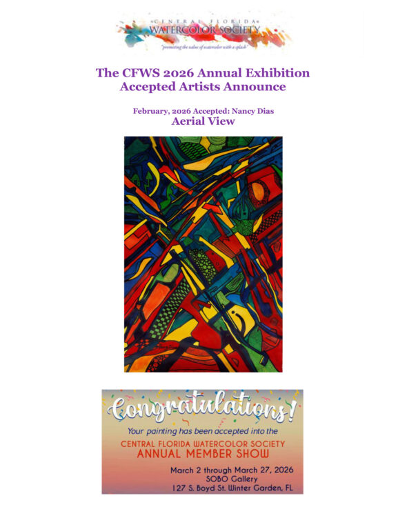 Nancy Dias’ painting, Exploration, will be shown at the 45th Annual Florida Watercolor Society’s exhibition this fall in Ocala FL.
